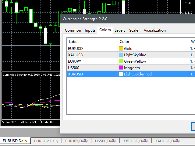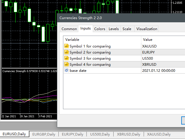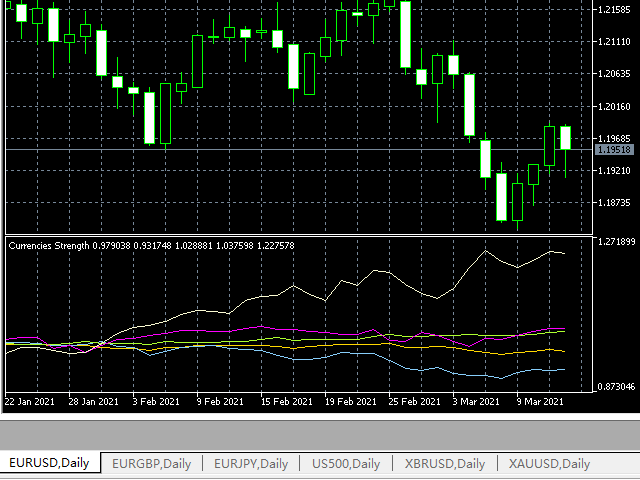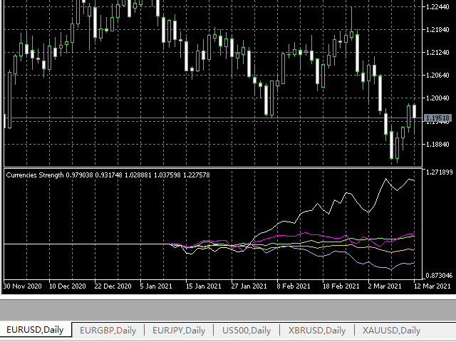 例如,你可以在EURUSD图表上应用这个指标,将其与货币对EURJPY和EURGBP进行比较,看看哪个更强。