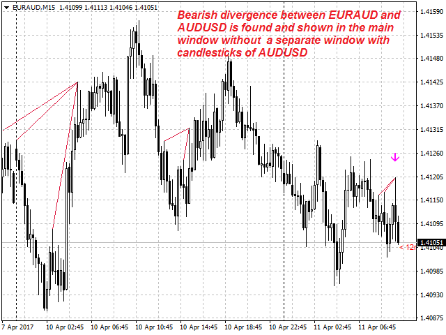 The indicator is not a lagging one. It works by ticks and is able to show convergence/divergence in the symbol's window even if there is no a separate window with a different financial instrument used for search. This allows you to open additional windows with any other indicators for a joint analysis.