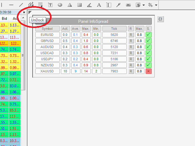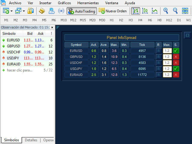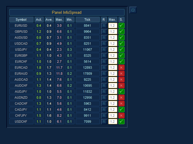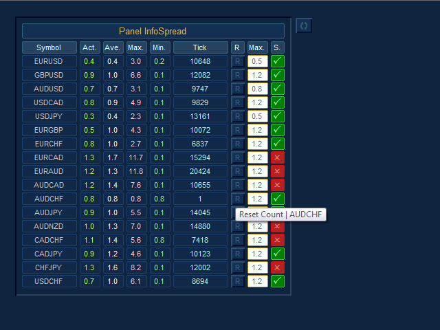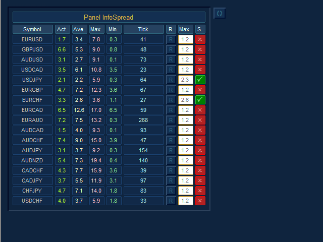 - We all want to have the lowest spread and never high, with this utility we can have more information and a clearer idea of when the spread is acceptable or not. The Panel InfoSpread is a utility expert advisor and shows information on different spread options in one or more symbols, can be actual spread, average, minimum, maximum and tick counter. Read and show the symbols that are in the Market Watch window. Also you can put a maximum limit of average spread in every symbol for know when you have a good spread or not. Each symbol has its own tick counter and its button to restart it