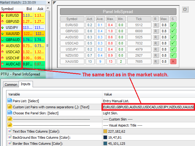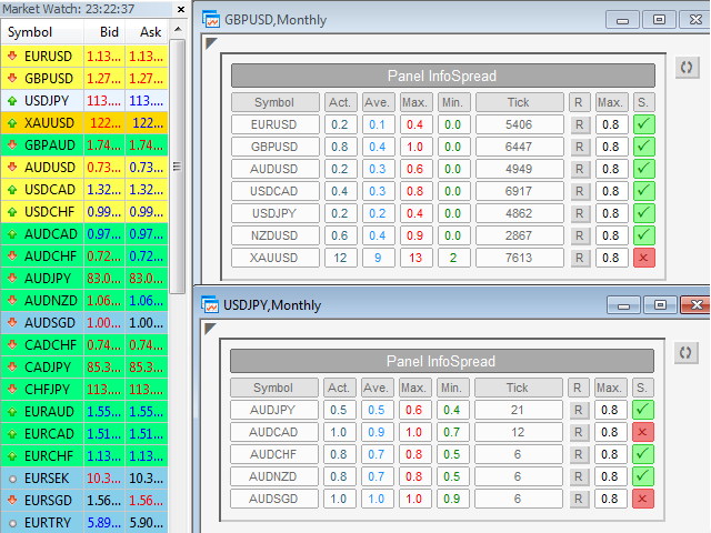 - The currency symbols that you want to use in the Panel InfoSpread should be those that are selected in the Market Watch (If the parameter Pairs List is selected Market Watch List ).