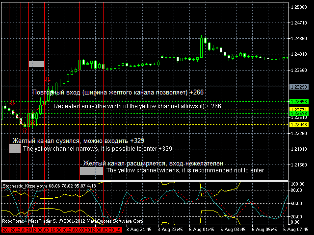 The market entry based either on the main line or on the crossing of the main line and the yellow channel is performed at trader's discretion.