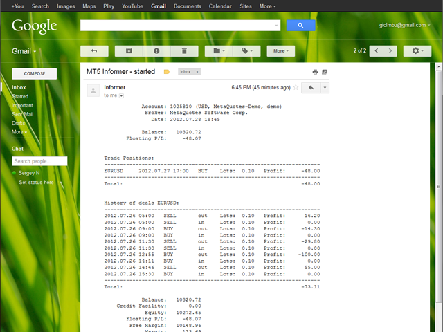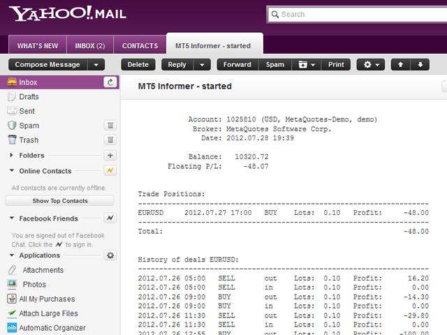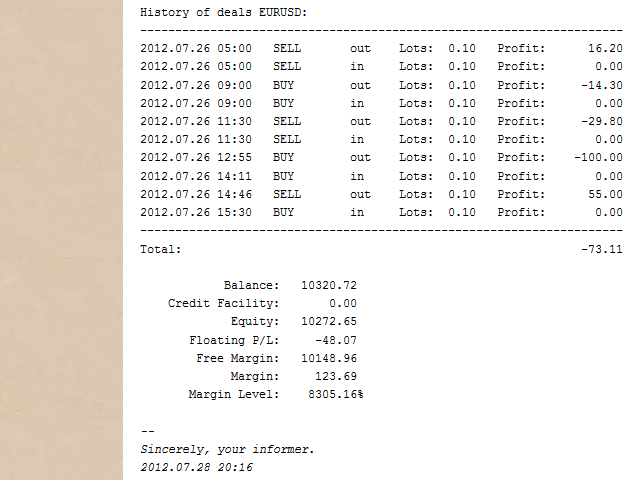 Informer for VPS - report on the state of your account via e-mail. Useful for controlling your Expert Advisors that run on a VPS or a dedicated computer. Information about open positions and last deals for a day, week, month or year grouped by currency pairs.