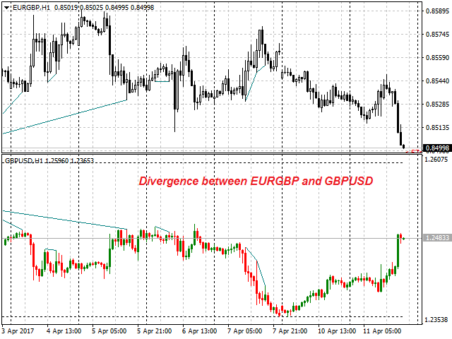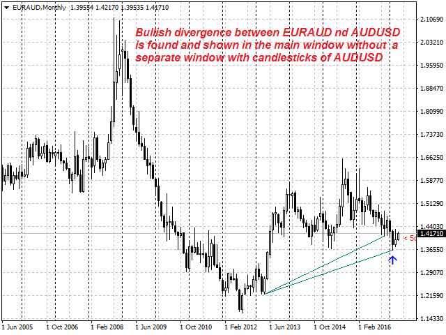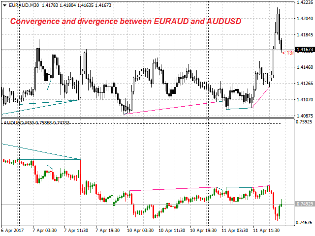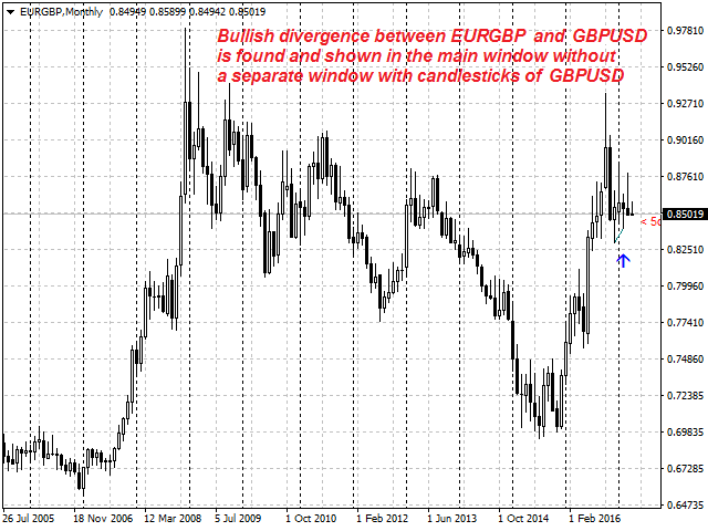 The indicator is not a lagging one. It works by ticks and is able to show convergence/divergence in the symbol's window even if there is no a separate window with a different financial instrument used for search. This allows you to open additional windows with any other indicators for a joint analysis.