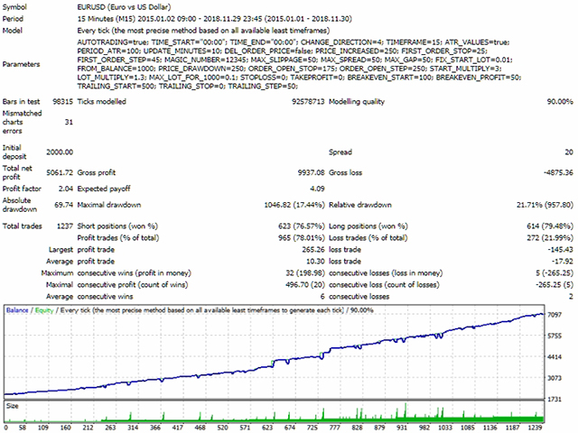 對於第一次接觸 EA 的人,我建議在策略測試器中打開可視化模式。我試圖讓顧問信息豐富,以便任何交易者都能理解其工作原理。