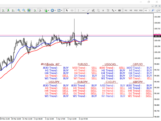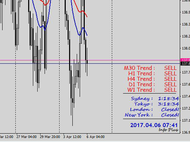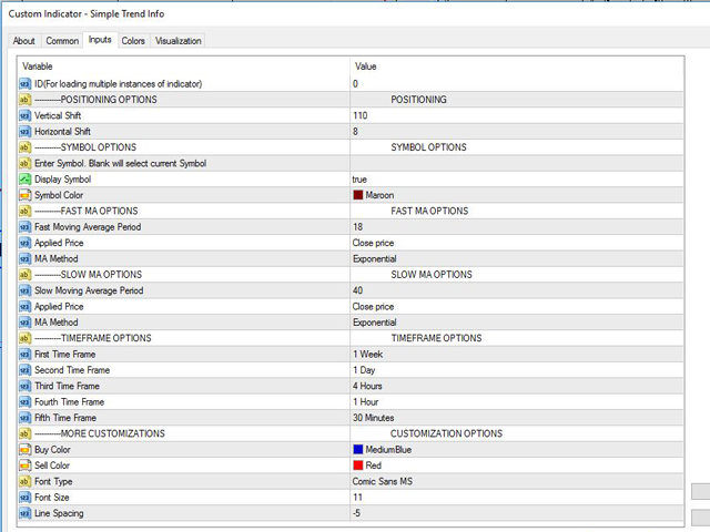 According to experts, trading against the trend is said to be hazardous, and perhaps sometimes it is a mistake that we easily make. Simple Trend Info is designed to display the trend of an asset class on different time frames and assists in minimizing trading against the trend. It uses the conventional moving averages to determine whether the trend is bullish or bearish and displays the trend on the screen. The time frames are limited to 5 options and you can adjust them as per your needs. The default time frames are: