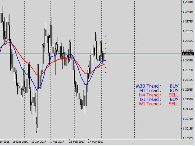 When the fast MA is above the slow MA, the trend is bullish. And when the fast MA is below the slow MA, the trend is bearish. Set the moving averages to the desired parameters (Period, applied price and MA method) and let the indicator determine if the trend is bullish or bearish. It will then display the trend of the asset class based on five time frames, which can be customized as one finds suit.