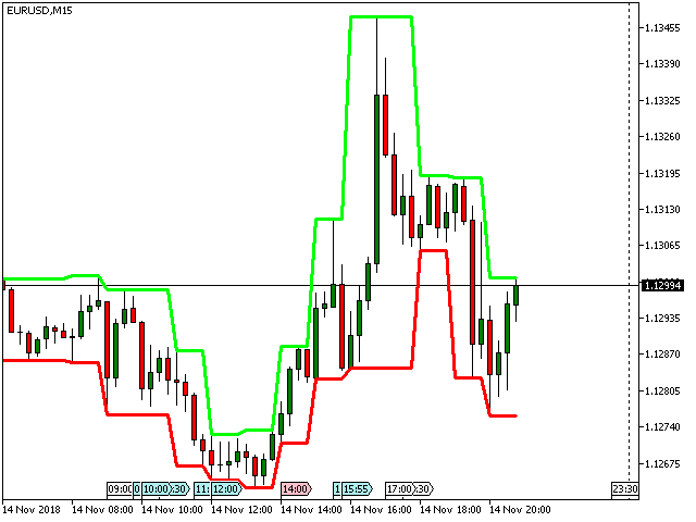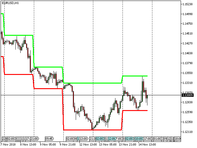 该指标根据设置中设置的较早时期的柱线极值水平绘制通道,并显示收盘价水平。要使指标正常工作,指标设置的当前周期必须小于指标设置中指定的周期。