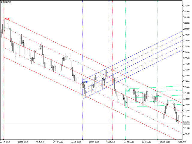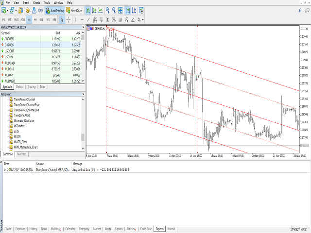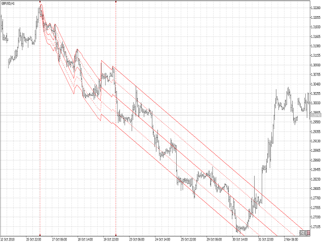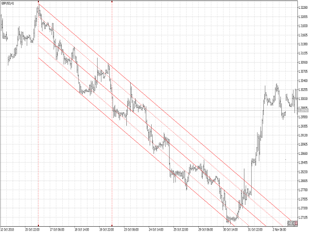 The principle of construction - on top of any number of bars set by the user, a channel is constructed with maximum and minimum lines so that the bars touch the maximum and minimum of the channel at exactly three points. The name of the indicator follows from this principle. Both vertical lines can be moved along the graph by the user, thus specifying the period on which the channel is built. After a specified period, channel rays are drawn that define a channel in which the price can move.