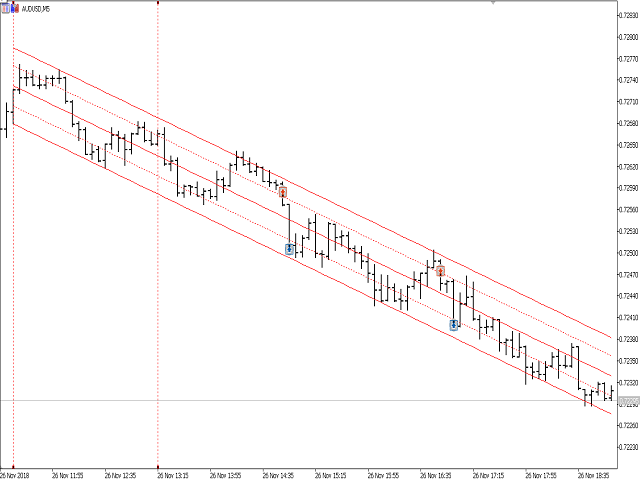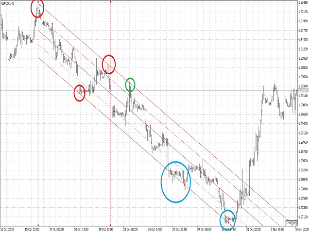 In the picture, the ThreePointsChannel channel is built on top of the bars between two vertical dashed lines. The three points along which the channel is built are marked with red circles. In the period between the two lines, the channel may redraw. The indicator has a parameter that prohibits redrawing. The right vertical dotted line shows a bar, after which the channel does not redraw. On the picture the green circle marks the moment when the price was in the overbought zone, a moment suitable for opening positions down. Blue circles mark the oversold zone, a moment suitable for closing positions down. The parallel lines inside the channel are the channel levels. By default, the Indicator takes the distance between the two main lines of the channel for 100% and draws lines of 23.6% (dotted line), 50% and 76.4% (dotted line) inside the channel. The percentage that the indicator uses to draw the channel is determined by the indicator parameter.