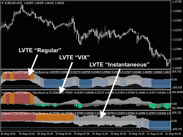 LVTE has 3 algorithm variants (Regular, VIX, Instantaneous), which can be used individually, or shown simultaneously for confirmation of a max/min. It can be plotted equally well on light and dark backgrounds. One great option is to view the 3 LVTE variants simultaneously and follow one of 2 strategies: