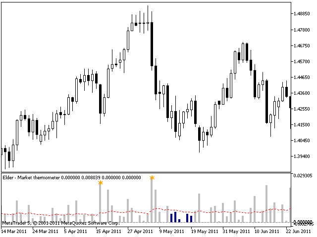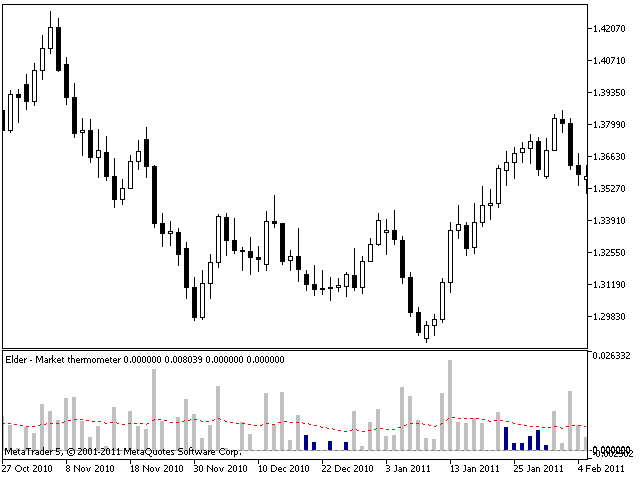 The Market Thermometer is described in "Come into my Trading Room" book. It measures the degree of volatility, as reflected in greater or smaller intraday ranges. When the Market Temperature spikes above its average or stays below its average for a number of days, it gives trading signals, as described in the book.