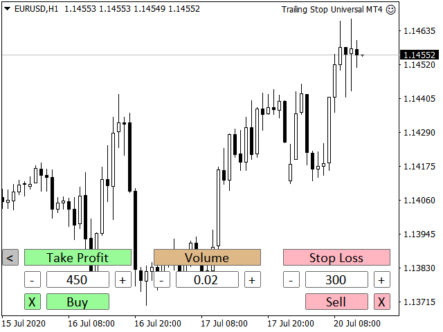 The utility has a simple and understandable trading panel that will allow you to open deals with a given size of Take Profit, Stop Loss and Volume. The trading panel can be used in real time and in the strategy tester. Thanks to the trading panel, users will be able to fully test the demo version of the product in the strategy tester. Just enable the trailing method you are interested in, launch the tester, open trades using the panel and watch how the trailing stop works according to the selected algorithm.