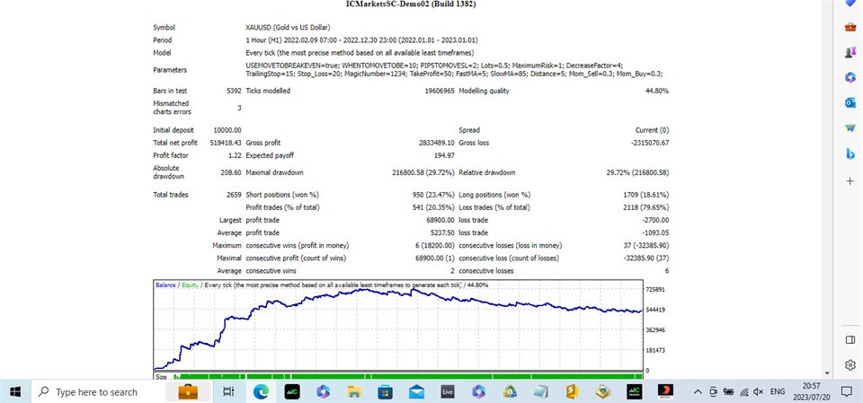 The XAU/USD Expert runs on MT4, 1 hour timeframe and can also be used as a scalper on 5min. Higher timeframes are not suggested. The standard setting for 1H timeframes are TP=2000 and SL=1000 1:2 RR ratio. The standard setting for Lot size is 0.01. These settings can be adjusted according to your risk management. The Ea was tested on 1year data with a $10k initial deposit and turned out over $500k.