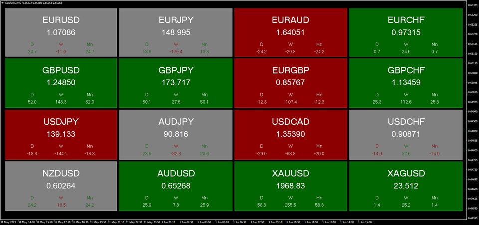 The dashboard indicator has been designed to quickly show the trader the price movements of various currency pairs.