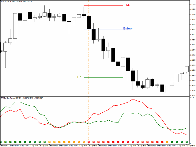 Bull Bear Powers indicator shows the absolute power of bulls and bears in the market. Both powers are shown simultaneously with red and green colors for bear and bull powers respectively. When red line goes over the green line it means that bears are controlling the market. When green line goes over the red line it means that bulls are controlling the market. The green/red horizontal symbol line at the bottom of the indicators shows which party has more strength.