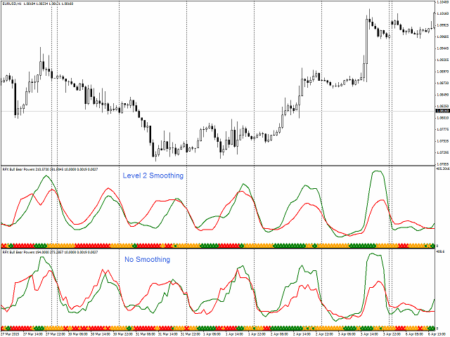 - Smoothing Level: Smoothing level applies a moving average to the bull and the bear power.