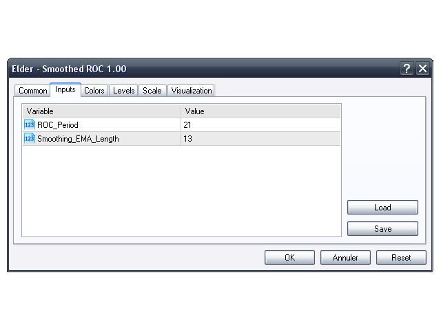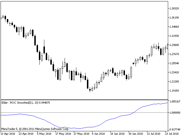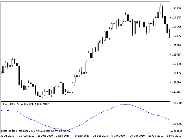 The Smoothed ROC indicator, developed by Fred Schutzman, is described in "Trading for a Living" book. It is created by calculating the rate of change for an exponential moving average of closing prices. When it changes direction, it helps identify and confirm trend changes.