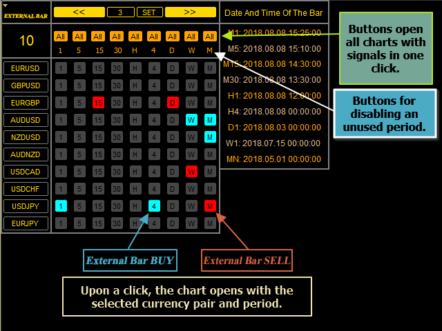 Панель предназначена для быстрого визуального нахождения и отображения внешних баров по всем периодам и на любых выбранных валютных парах одновременно. Цвет сигнальных кнопок, указывает на направление паттерна. По клику на сигнальную кнопку, осуществляется открытие графика с данным паттерном. Отключить не используемые периоды, можно кликом по его заголовку. Имеется поиск в истории (по предыдущим барам). Прокрутка (scrolling) панели, осуществляется клавишами "UP" "DOWN" на клавиатуре. Имеется Push-уведомления. DoNotHideExternalBar - это продолжение серии индикаторов DoNotHidePinBar и DoNotHideInsideBar.