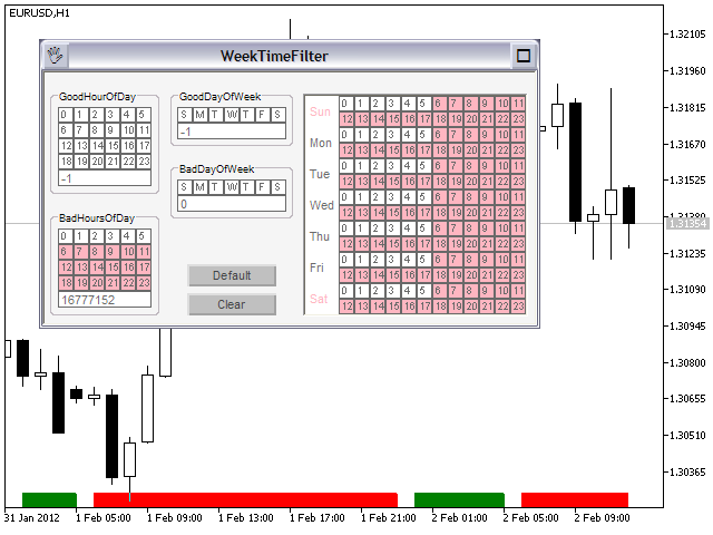 TimeFilter indicator allows to select visually bit masks (GoodHourOfDay, BadHoursOfDay, GoodDayOfWeek, BadDaysOfWeek), used in the Intraday Time Filter module of the Standard Library. The use of time filters allows to take into account the details of trade sessions.