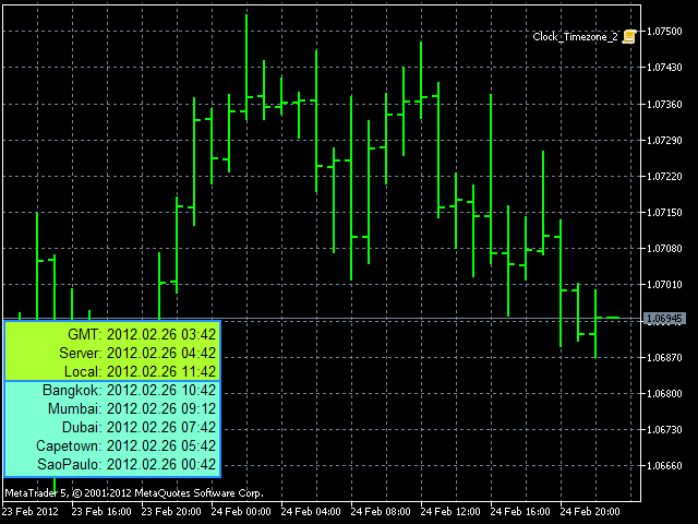 The script allows to easily watch the date and time of several cities selected by the user from more than 30 important cities all over the world. It also shows GMT, Server time and Local time.