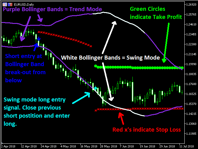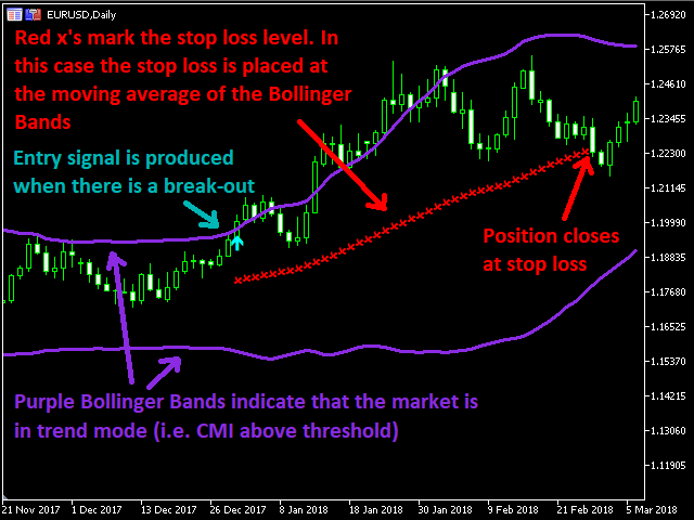 - Only Stop Loss is placed at the moving average of the Bollinger Bands. If a different MA is used, the stop loss will be placed at the opposite BB should that be closer to the entry price.
