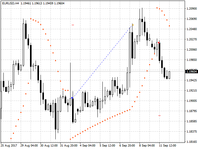 In the EA, a buy signal or uptrend is when the first dot of the Parabolic SAR appears below the low of the bar when there is a trend change. A sell signal or downtrend is when the first dot of a trend change appears above the high of the bar.