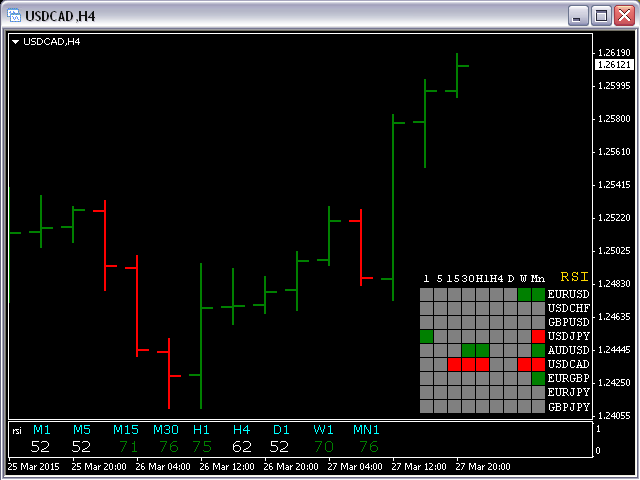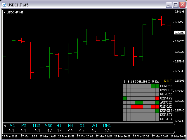 This indicator shows data from 9 currency pairs by your choice for all 9 Time Frames.