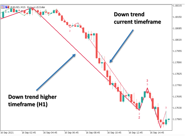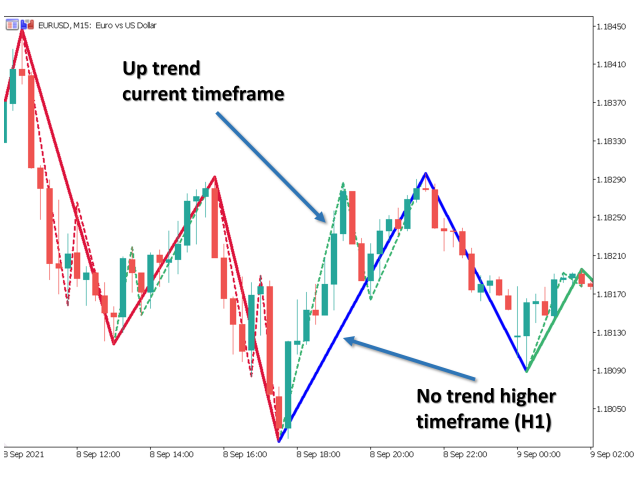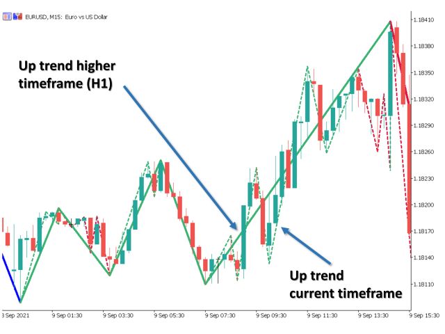 The PRO version is a multi timeframe zigzag (MTF). Means, it shows the trend of the current timeframe as well as the trend of a higher or lower time. You can set the second timeframe in the input options