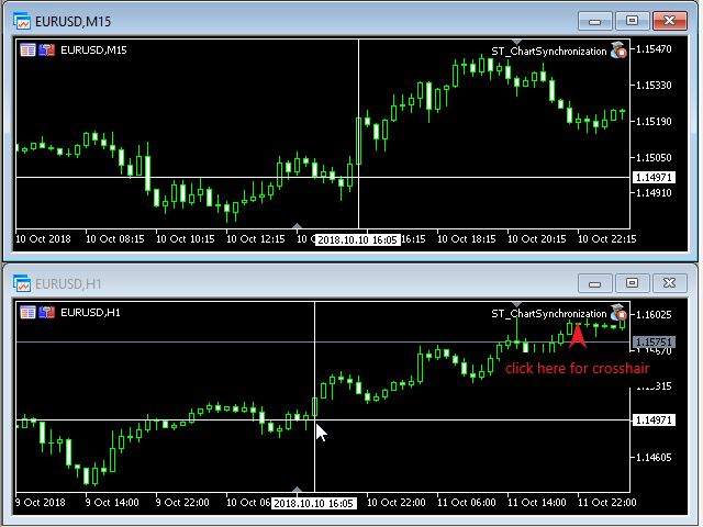 Synchronize crosshair - allows to turn on/off crosshair tool by left click at the right-top corner of the chart on utility's name. This is not MT4 standard crosshair (ctrl+F), only a substitute.