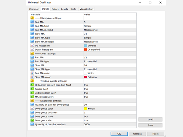 Универсальность индикатора заключается в том, что можно настраивать его гистограммы и линии на тех параметрах, которые вас интересуют. Тем самым вы формируете торговые сигналы (которые я указал ниже) исходя из своих торговых предпочтений. Universal Oscillator даёт возможность отслеживать дивергенцию и пересечение линий по интересующих вас условиям.