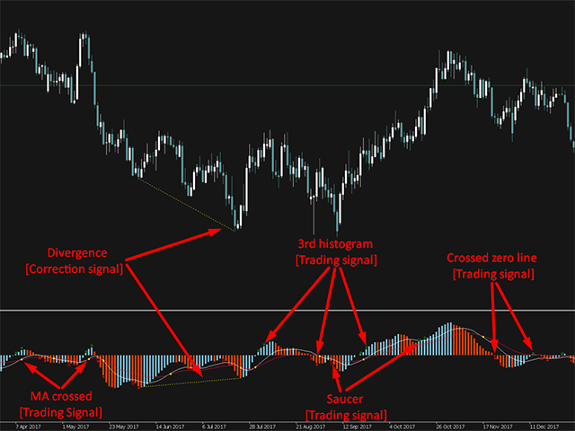Индикатор является вспомогательным инструментом для анализа и нуждается в дополнительных трендовых инструментах, если вы работаете на пробой. Если же торговать на коррекциях, то данный индикатор отлично справляется с этой задачей. Сигнал «Crossed zero line» является сигналом смены тренда, а «3rd histogram» подтверждает его. « Saucer » необходимо использовать на добавление позиций или фиксации ранее открытых сделок. Линии Universal Oscillator отображают коррекции внутри тренда. Если быстрая МА пересекла медленную сверху вниз и гистограммы + линии находиться выше линии баланса, то это сигнал для открытия позиции против текущего растущего тренда (сигнал на продажу является зеркальной ситуацией).