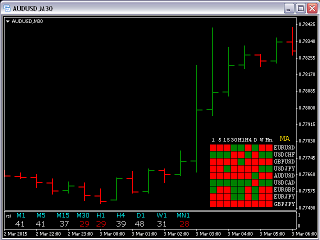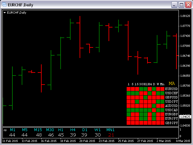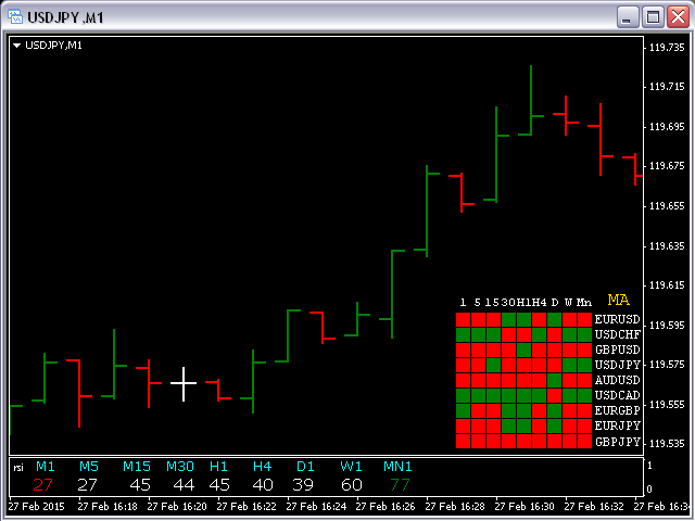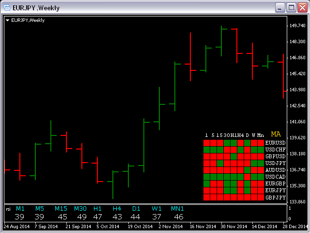 This indicator shows an Up trend (Green square) if a fast MA is above a slow MA and Down trend (Red square) if a fast MA is below a slow MA from all Time Frames for each currency pair.
