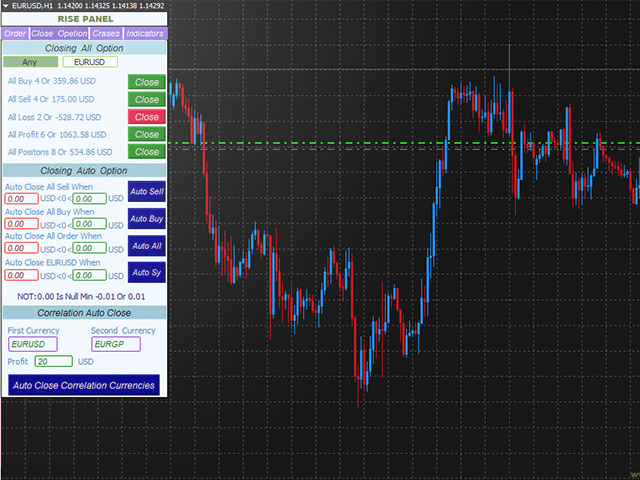 - Close positions automatically (all positions of the account, all buy position, all sell position, all the pair currencies positions).
