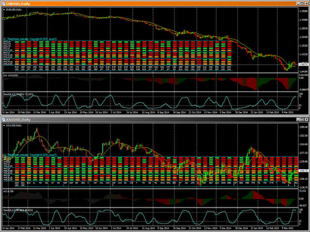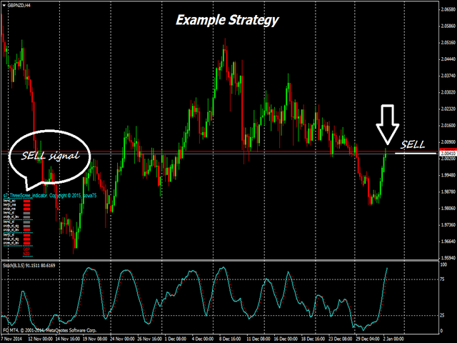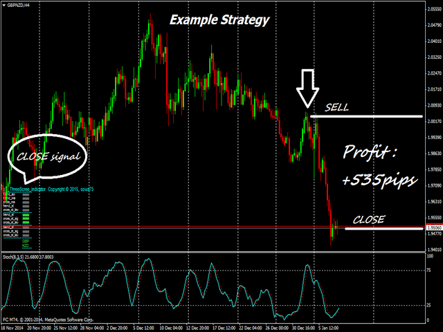 The indicator uses the modified Triple Screen Strategy for determining trend direction in the third window via Awesome Oscillator, Moving Average or Stochastic Oscillator at the trader's discretion. The oversold/overbought level is determined in the second window via Stochastic indicator. We also use Stochastic indicator in the first window, but this time we are determining the best market entry point. As a result, we obviate the necessity to move pending orders according to the market (what the classical system requires) and can enter the market at once.