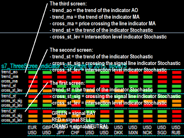 The indicator is intended for manual multi-currency trading based on the Triple Screen Strategy.