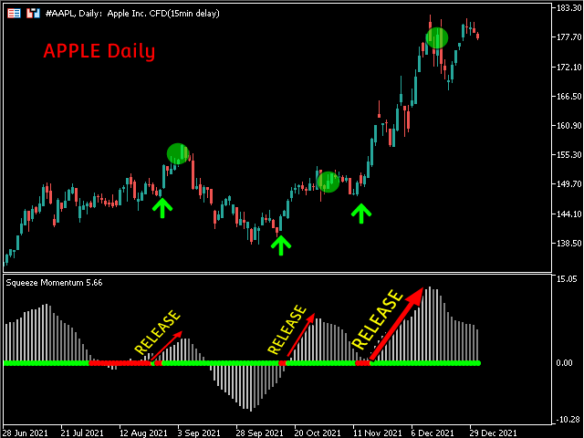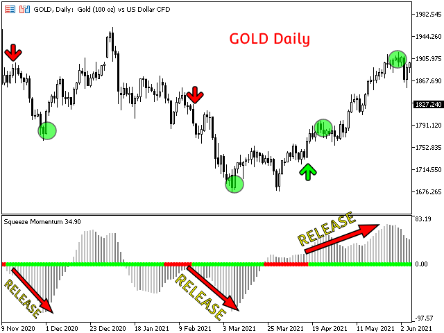 Red dots on the middle line indicate that the market has entered a "Squeeze" zone or consolidation period, indicated in this enhanced version by a combination of the Bollinger and Keltner Bands. These periods indicate that the market is preparing itself for the next explosive move. The start of this movement is indicated by the green dots on the middle line.