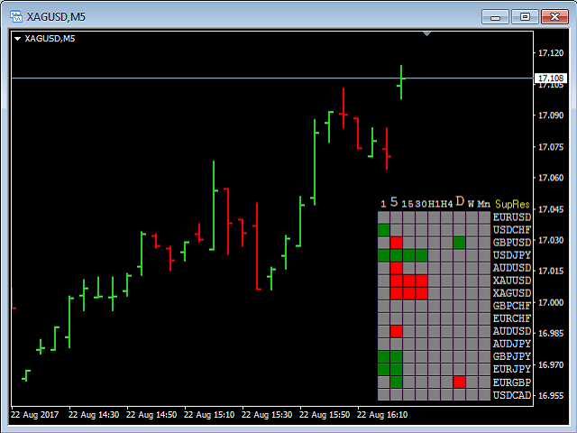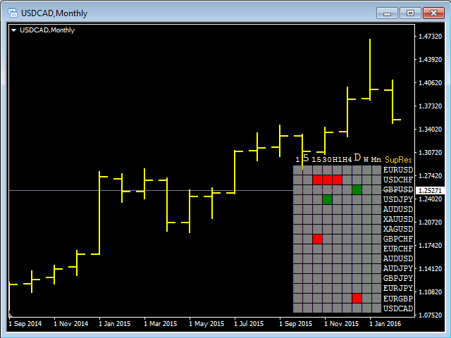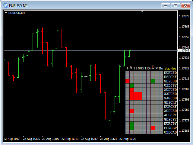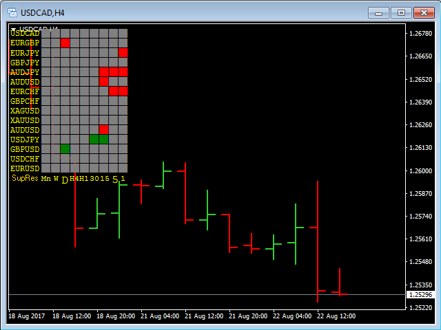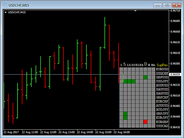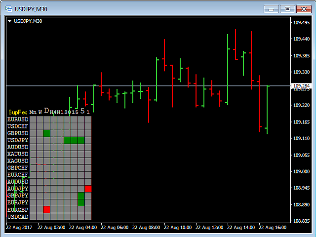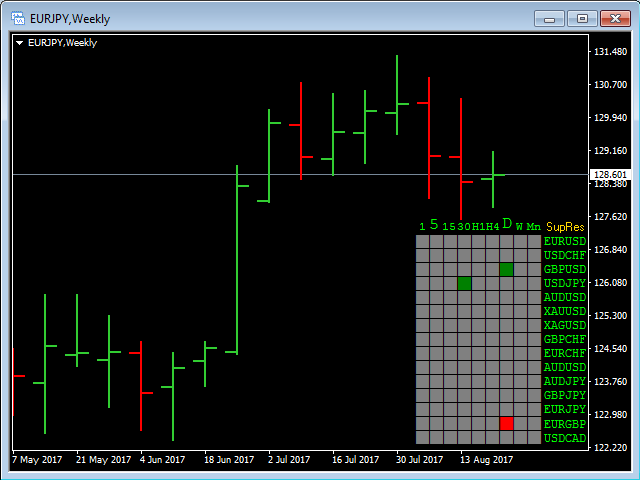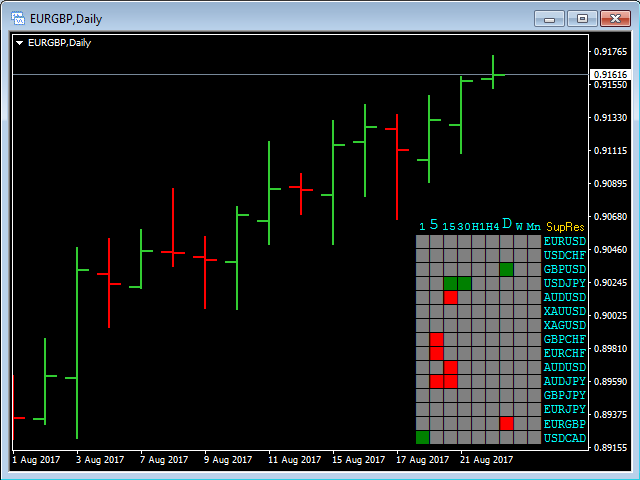 The Support Resistance Scoreboard Indicator will show Red squares (Buying opportunity) in case the currency pair is reaching a resistance level for the current TF and Green squares (Selling opportunity) in case the currency pair is reaching a support level for the current TF.