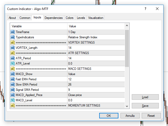 This indicator has the possibility to offer a series of algorithmic calculations such as: RSI, Vortex, MACD, Momentum, Stocastic and ATR.