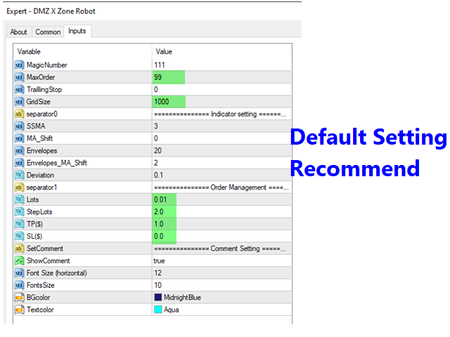 Expert Advisors Default parameters