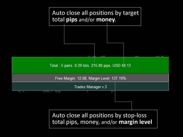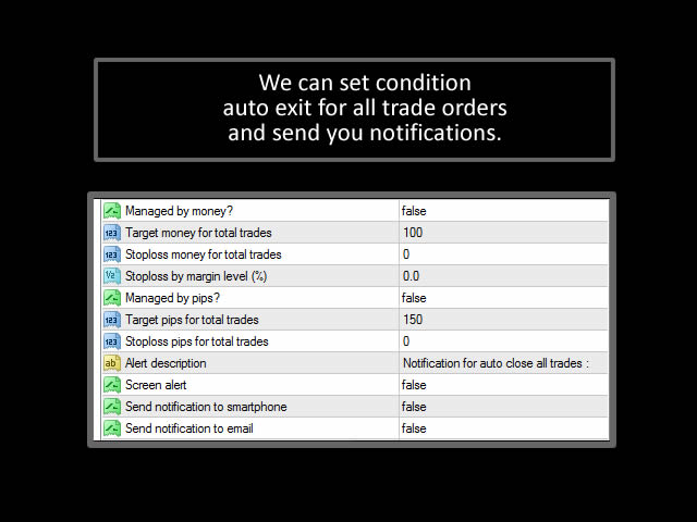 - Reaching Total stop loss , based on total pips, total money, or margin level (%).