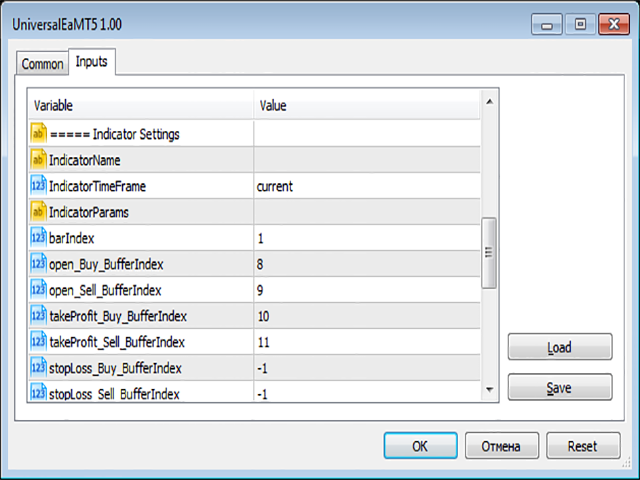 -startLot - fixed volume of deals;-riskPercent - risk per trade for volume calculation;-takeProfit, stopLoss - TP and SL values in points;-stopLossBars - stop level at the minimum/maximum of the specified number of candles;-noLoss - value in points for transfer to breakeven;-minProfit - value in points for partial closing;-minProfitFactor - volume for partial closing;-trailStop, trailStep - value and step in points for trailing;-trailAfterNoLoss - trailing permission after transfer to breakeven;-numOrders - number of unidirectional orders;-bothOrdersDir - permission to trade in both directions;-reversalClose - closing reverse trades;-tp1_factor, tp1_factor, tp1_factor - closing level for TP1, TP3, TP3;-IndicatorName, IndicatorTimeFrame, IndicatorParams - name, period and string of indicator parameters;-barIndex - indicator bar index;-open_Buy_BufferIndex, open_Sell_BufferIndex - buy/sell buffer index;-takeProfit_Buy_BufferIndex, takeProfit_Sell_BufferIndex - TP buffer index;-stopLoss_Buy_BufferIndex, stopLoss_Sell_BufferIndex - SL buffer index;-close_Buy_BufferIndex, close_Sell_BufferIndex - close buffer index;-minProfit_Buy_BufferIndex, minProfit_Sell_BufferIndex - partial closing buffer index;-noLoss_Buy_BufferIndex, noLoss_Sell_BufferIndex - transfer buffer index to breakeven;-TP1_BufferIndex, TP2_BufferIndex, TP3_BufferIndex - indexes for TP1, TP2, TP3;-useColorBuffer, buyBufferValue, sellBufferValue - sign of using a color line and value for signals.if the buffer is not used, then set the value to -1