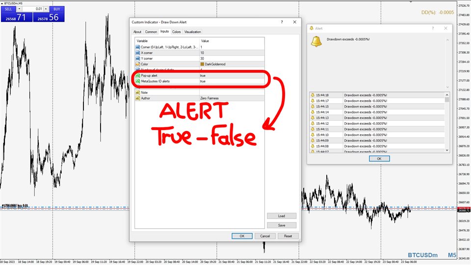 This Drawdown Alerts indicator shows the drawdown percentage in real time and alerts you when the limit you specify is reached.