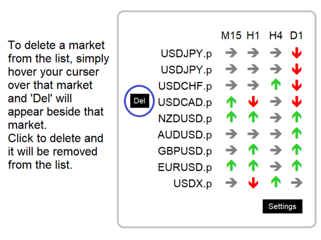 When you view a market on your chart, the indicator will automatically display the trends of all the time frames you want to see for that market. If that market has the trend agreement you want to trade , you can simply click 'Add' and that market will be added to the watch-list. When the trends of a market on the watch-list break down and no longer show agreement, hover your cursor over that market and 'Del' will appear beside it, so you can delete that market from your list. FOCUS ON THE BEST MARKETS FOR EVERY TRADE. All the markets displayed on your MT4 Market Watch can also be accessed from within the indicator settings and added to your display list. You can choose up to 9 time frames to follow, from the 1 minute to the 1 month time frames.