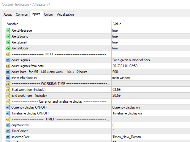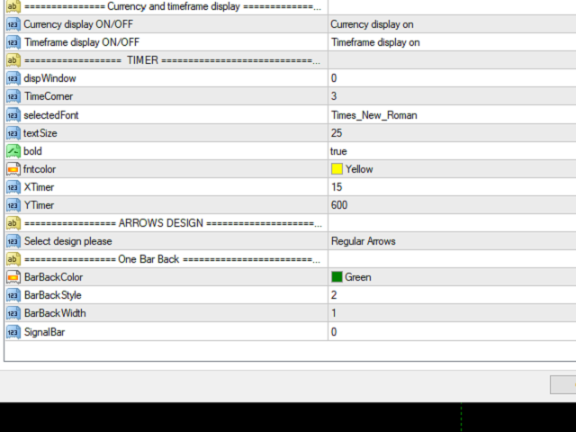 Below are the settings of the timer that counts down the time until the end of the current candlestick. The advantage of the timer is that it works without delay. Using settings, you can move the timer along the chart, change its color, the size of the clock, etc.