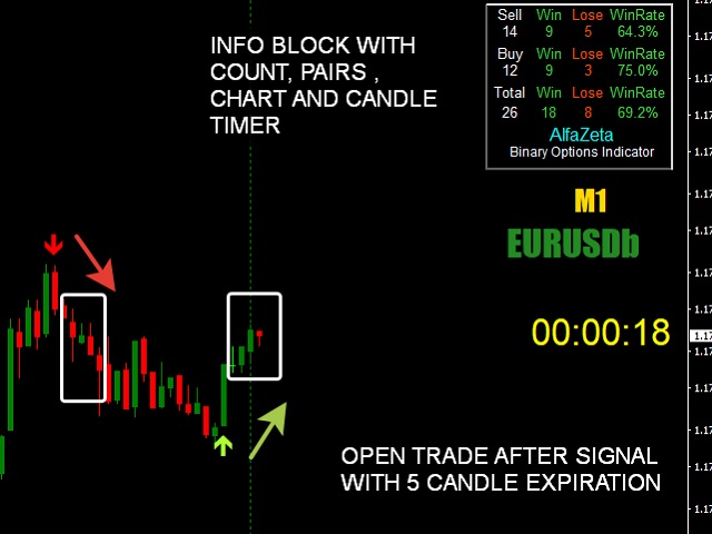 The indicator is provided with a trade counter, it also displays the selected timeframe, currency pair and timer showing time left before the end of the current candlestick. All these parameters can be configured in the indicator settings.