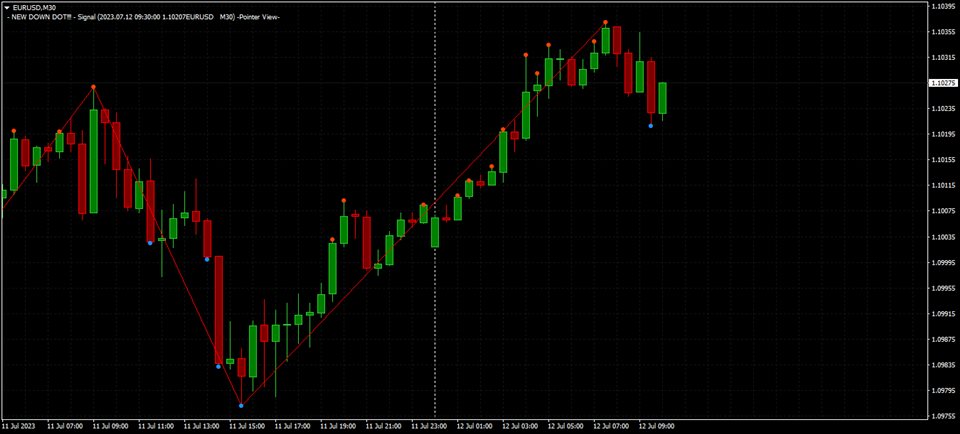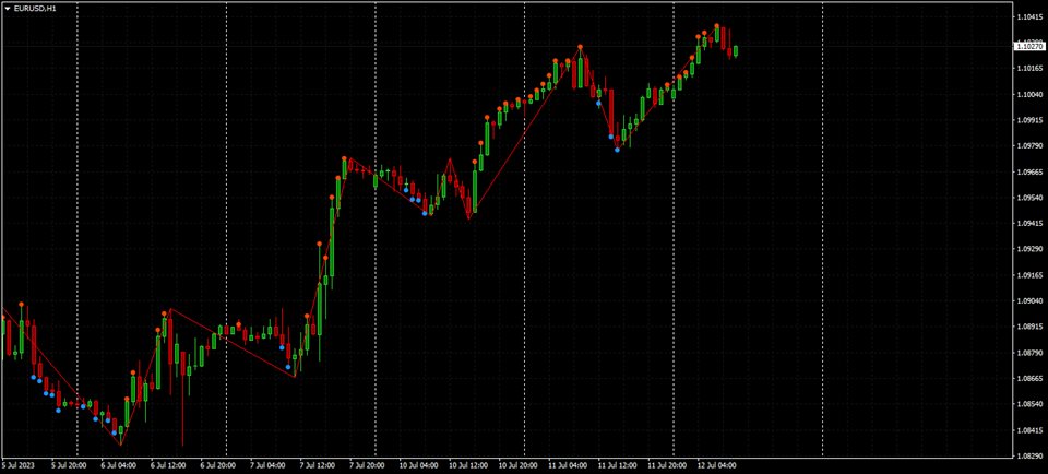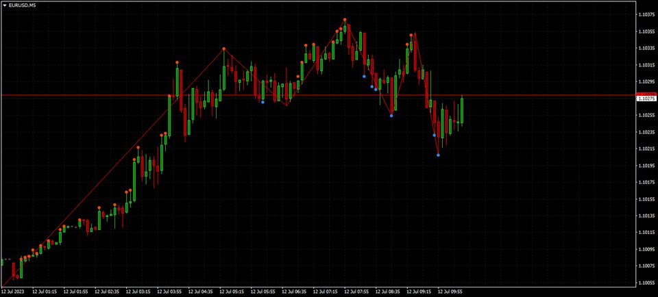 The indicator marks the points on the chart where the standard ZigZag indicator has drawn its top or bottom.