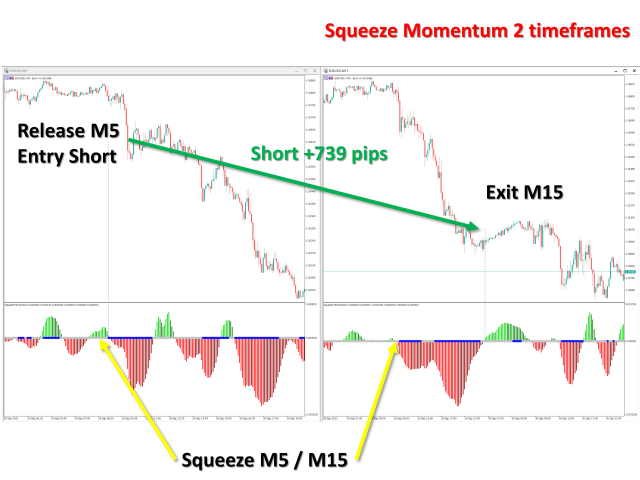The indicator works best when two or more timeframes are in a squeeze. For example, both 15min and 5min periods are in a squeeze period. Enter a trade in the direction of the movement when 5min period is released from squeeze.