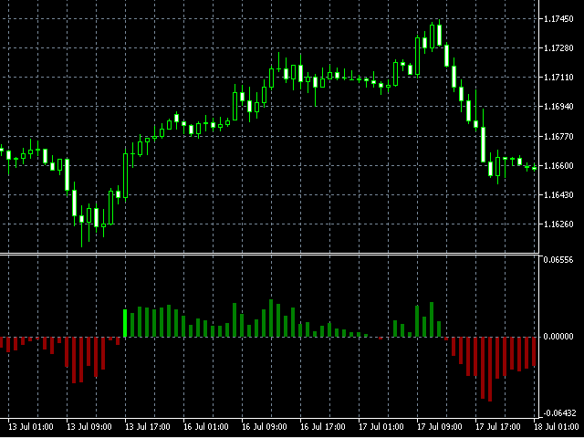 Delta EMA is a momentum indicator based on the changes of closing price from one bar to the next. It displays a histogram of the exponential moving average of those changes, showing magnitude and direction of trend. Positive delta values are displayed as green bars, and negative delta values are displayed as red bars. The transition from negative to positive delta, or from positive to negative delta, indicates trend reversal. Transition bars that exceed a user specified value are displayed in bright green or bright red, alerting the trader to potential buy and sell signals. The screenshot shows a transition bar displayed as a buy signal because it exceeds the default threshold value on the H1 chart of the EUR/USD currency pair. The transitions back to negative delta show good exit points for the trade. The indicator is expressed in terms of percent change, averaged over the number of bars specified by the user, so settings that work for one currency pair can be applied to other pairs.