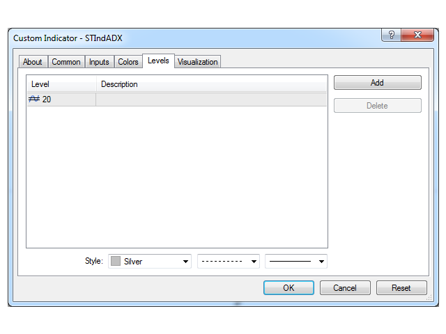 The indicator also provides the ability to customize display of levels, as well as colors of the lines. By default, the following values are used: