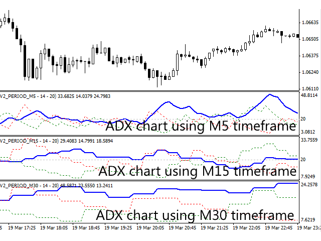 Unique indicator with the ability to display ADX charts not only on the current timeframe, but also on higher ones. The example attached shows how it is possible to see 3 ADX chart on M5, M15 and M30 timeframes respectively. This functionality allows to significantly improve the accuracy of determining the trend.